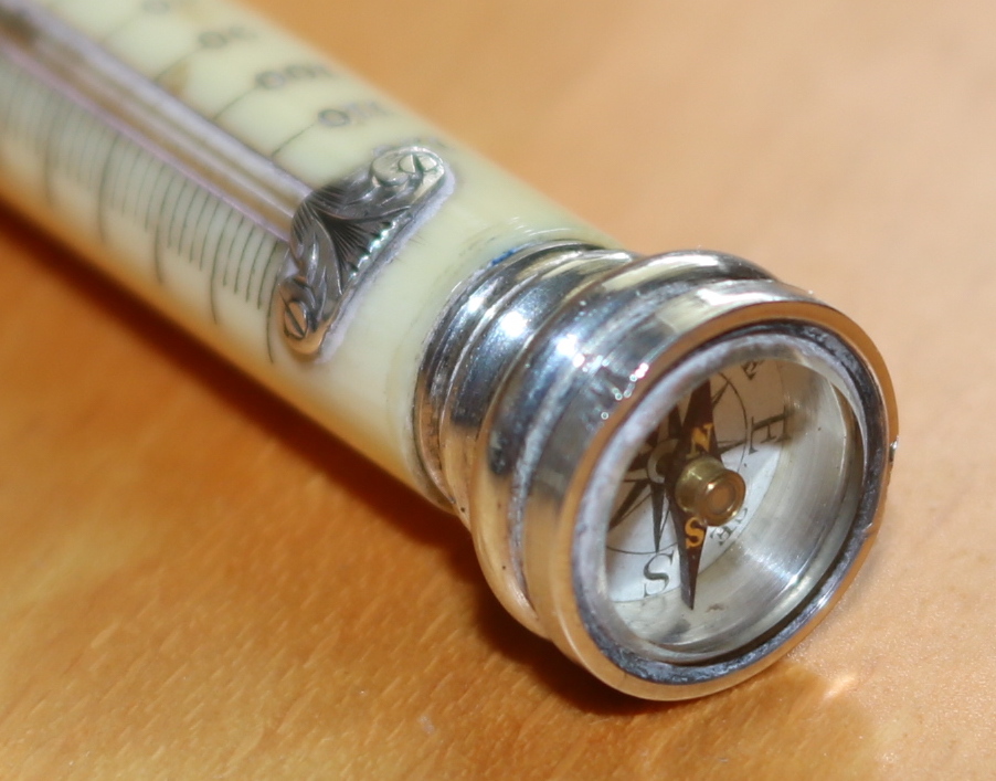 Writing implements such as this were referred to as “travellers” for rather obvious reasons as they included a pencil, dip pen, thermometer, and a compass in the finial. It is a fairly rare item, and it is even rarer to find one with the mercury thermometer not only intact, but actually still working. It is 4.25″ (10.5 cm) in length when closed, and just under 5.25″ (13 cm) when the pencil is extended. The pen nib is gold, stamped “Adamant Pointed London”.