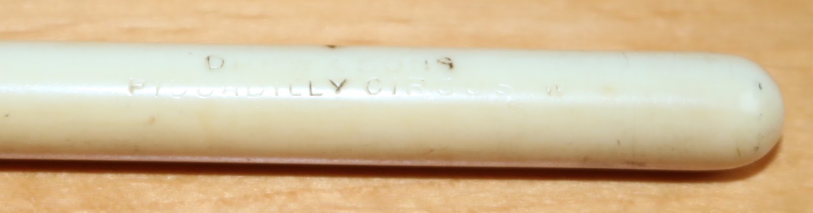 Pencil #4 is a bit of an odd duck, and likely requires more research before I can determine the actual maker with more certainty. It is a tablet style pencil; a full 6″ in length. Examining the barrel under the loupe I was able to make out “Drew & Sons Piccadilly Circus W”. After a bit of digging I was able to determine that John Drew founded the company in 1844, with his sons Samuel and Ernest eventually taking over. The company was known as a supplier of high-end gentleman’s accessories, including items such as cigar cases, picnic baskets, flasks, luggage, and … pen sets.
