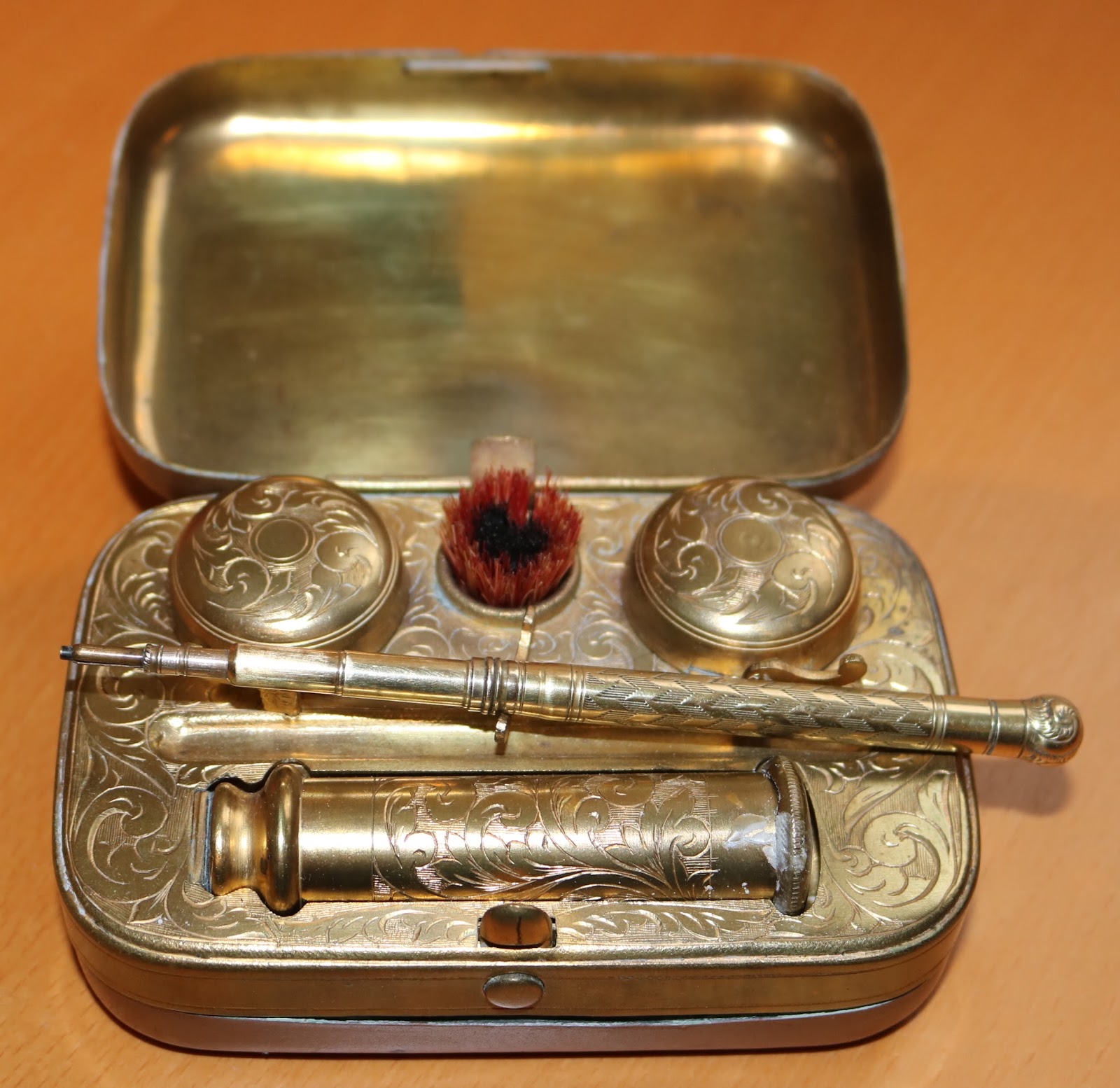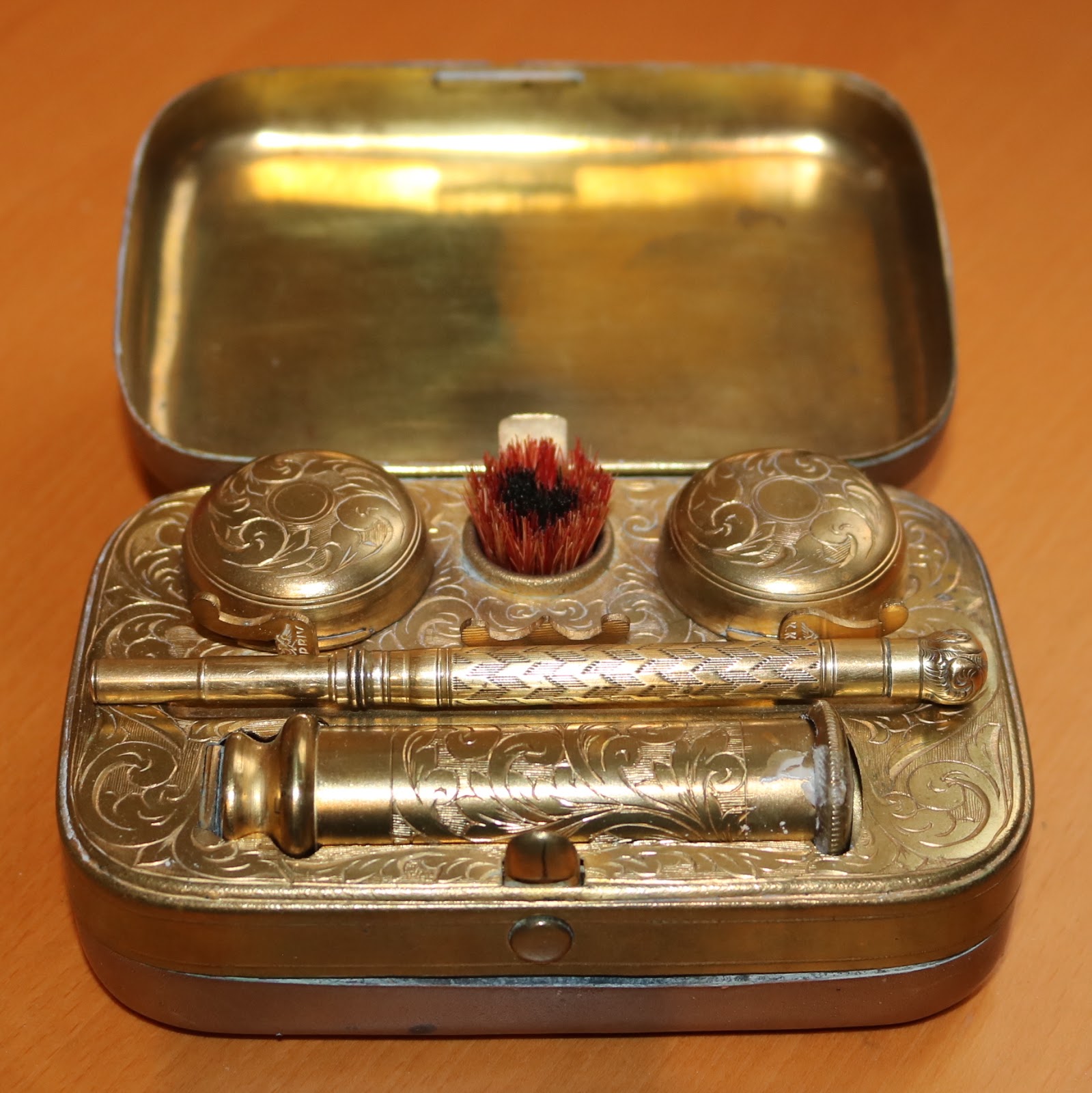Some of these travelling sets were very basic and consisted of just the sealed ink container, with pens, etc. carried separately. This one includes a great deal more. It has two sealed ink reservoirs, allowing for two different colours of ink, or twice as much of your favourite colour, a small pen wipe, a flip-up candle, a pen rest, and a reversible pen/pencil combo to complete the set.