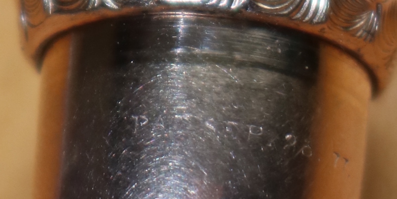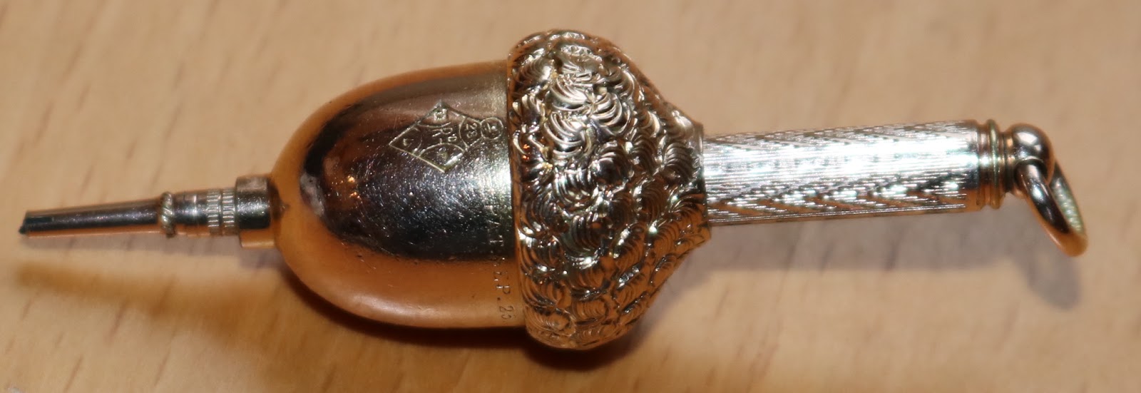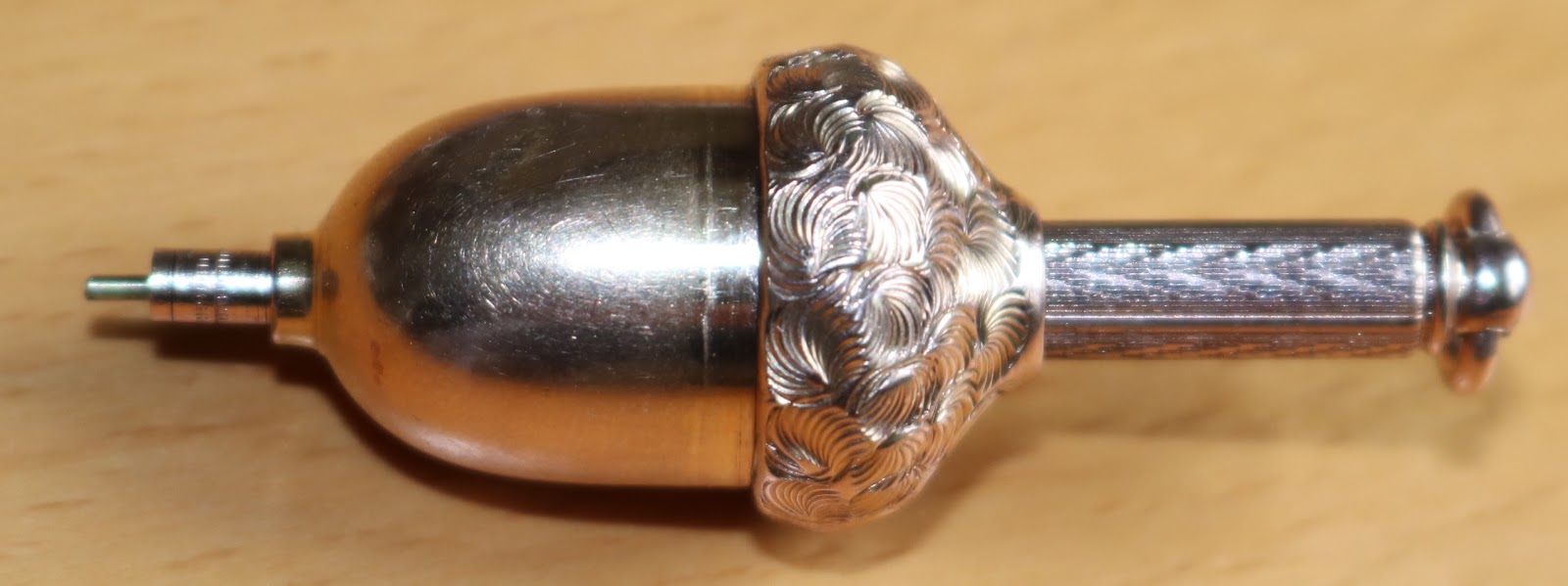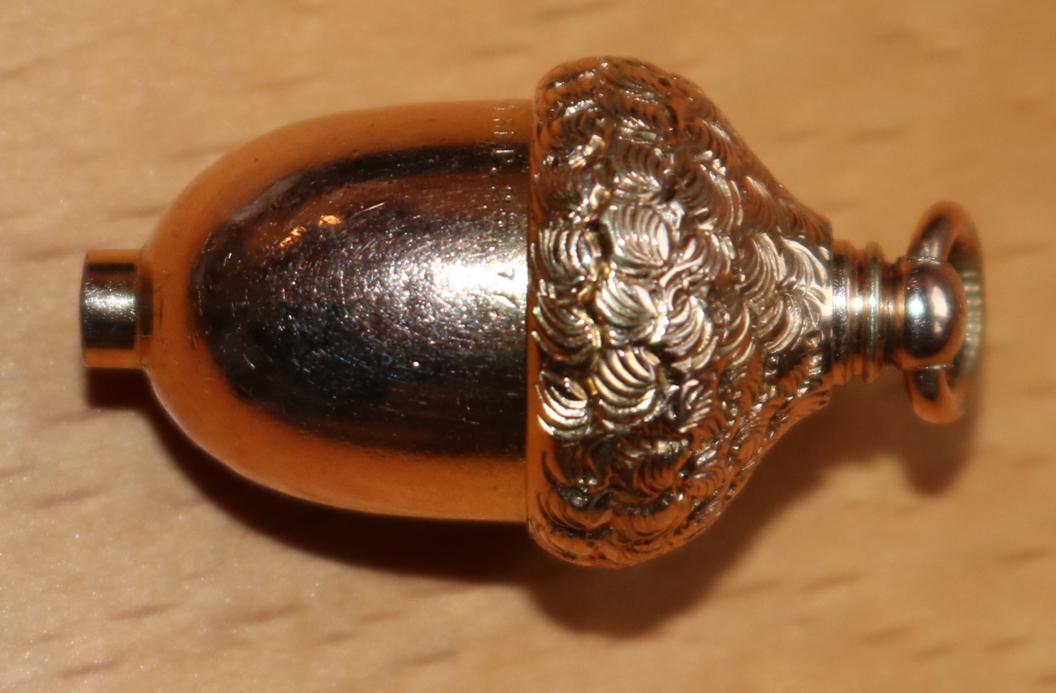 The second acorn is more intriguing. It is imprinted “L.W.F.” for “Leroy W. Fairchild”, another American maker and a contemporary of Hicks. Side by side, these two acorns appear to be almost identical twins. The most noticeable differences are that the Fairchild barrel is a little shorter and stubbier than the Hicks, and the engraving on the cap is more detailed on the Fairchild.*