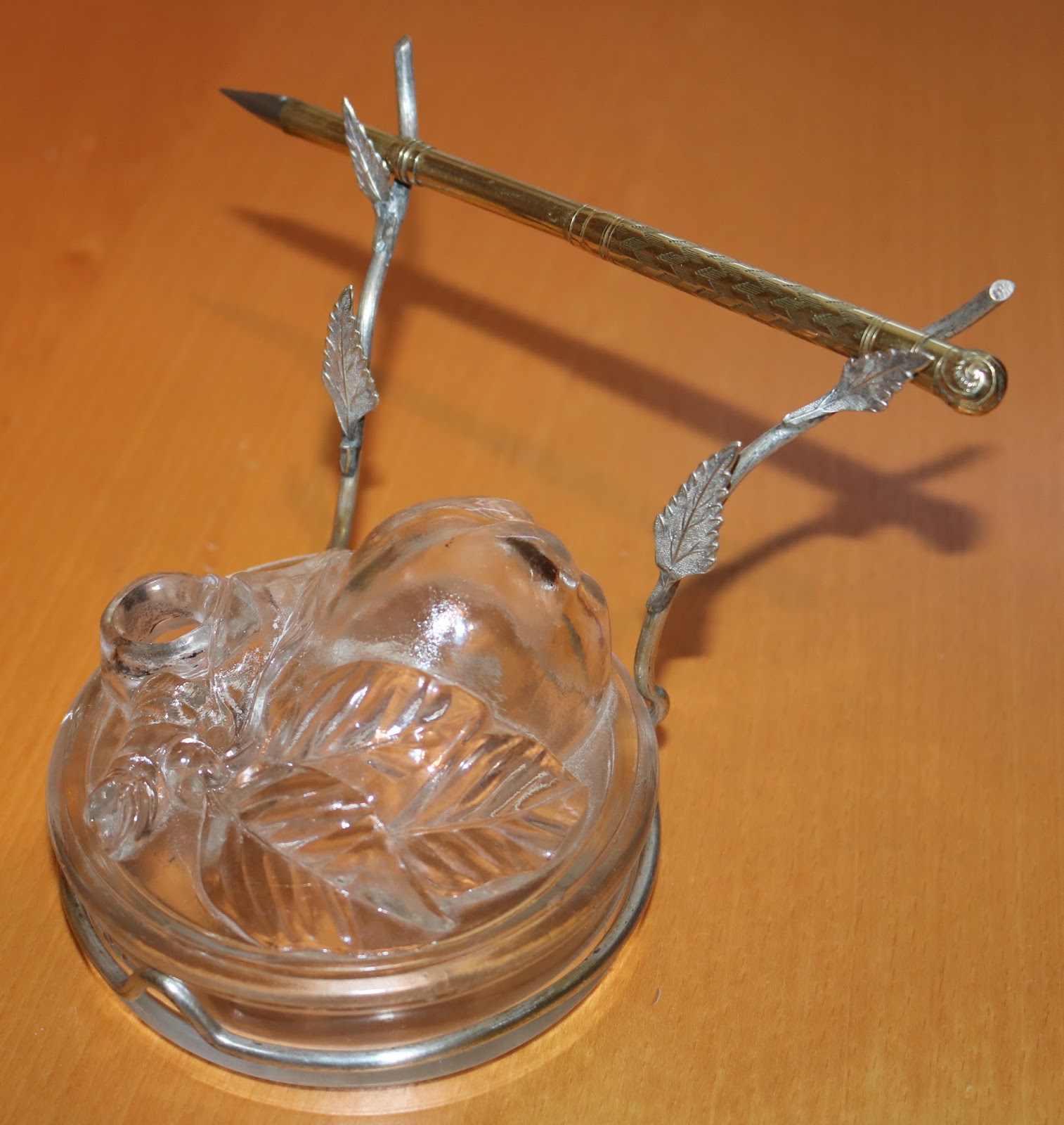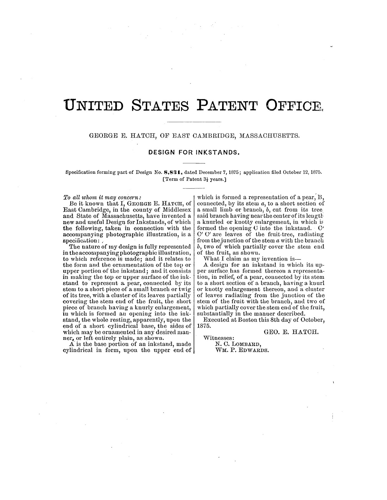 As explained in detail in his Design Patent submission, Hatch’s molded glass inkstand design is in the form of a pear, connected by its stem to a short branch with leaves. A knot in the branch forms the inkwell opening. The pen holders are silver “branches” with leaves forming the actual pen rests.
