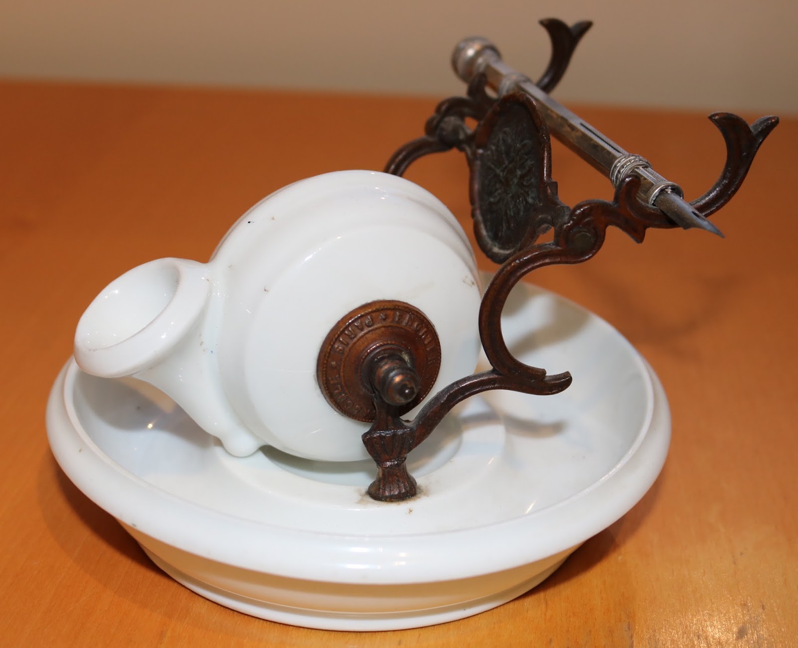 This double one has been made out of milk glass with the “snails” being molded into dog faces. Likely american made (they tended to have heavy metal bases on most of them).
