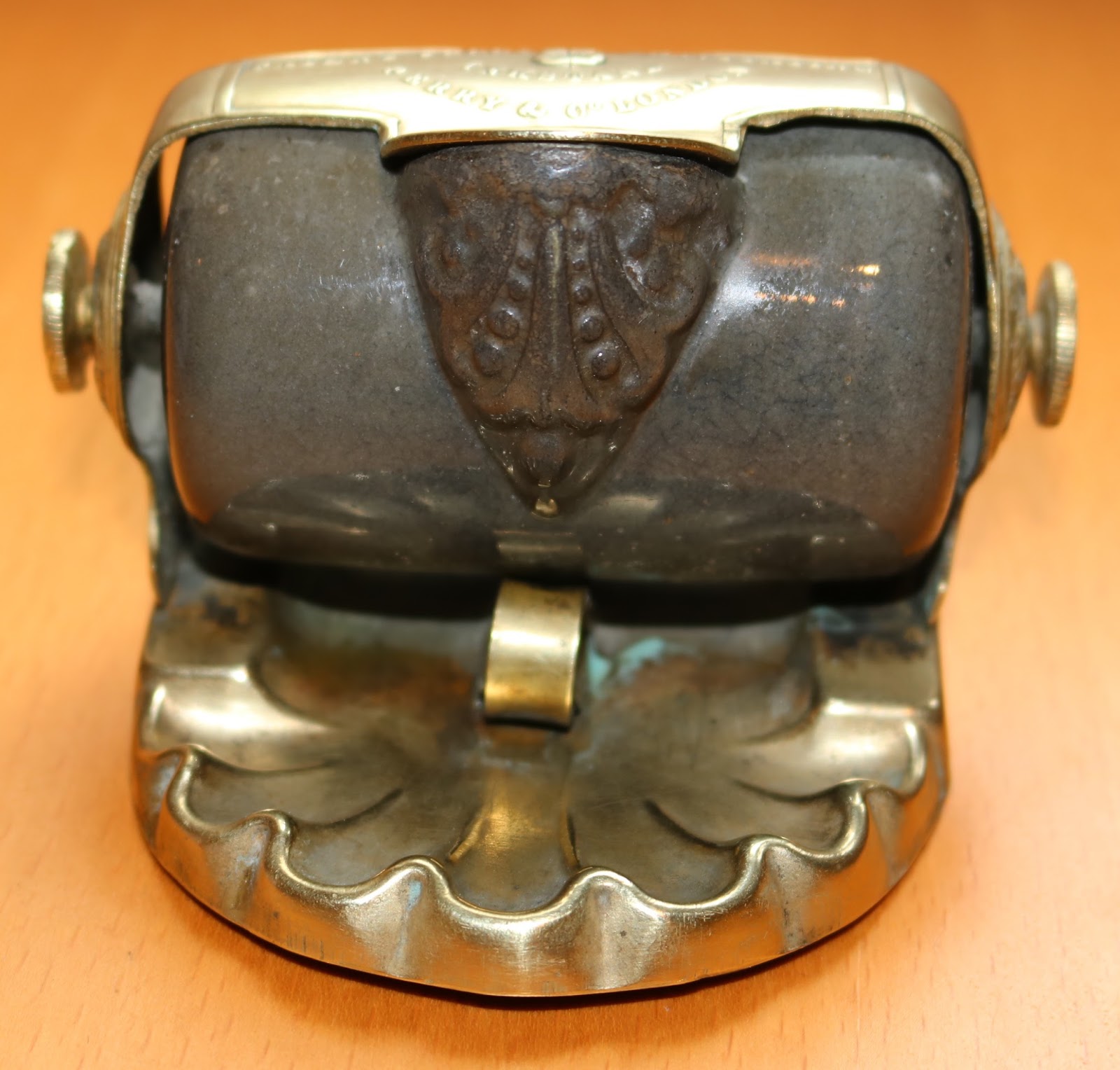 The ceramic cylinder could be filled with ink, and when not in use it could be rolled upwards and “locked” in place by a small brass wedge that slides under the cylinder. The novelty of the inkstand was that this action allowed the ink to be protected from dust and from evaporation between uses.