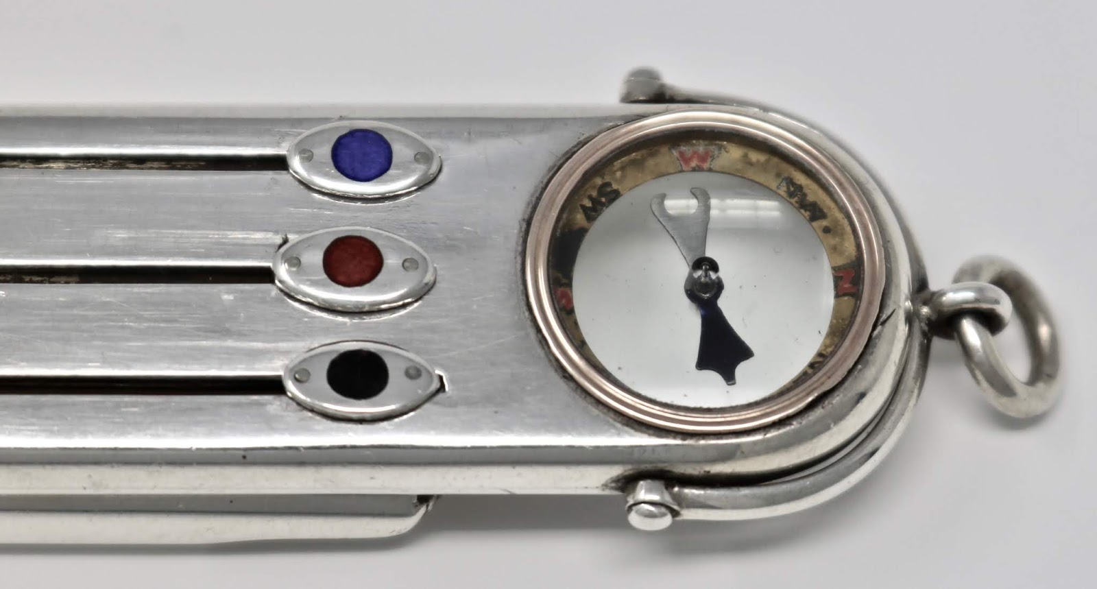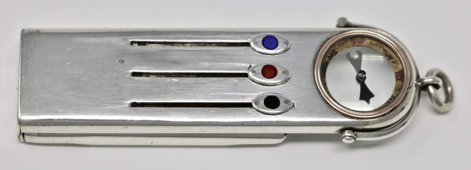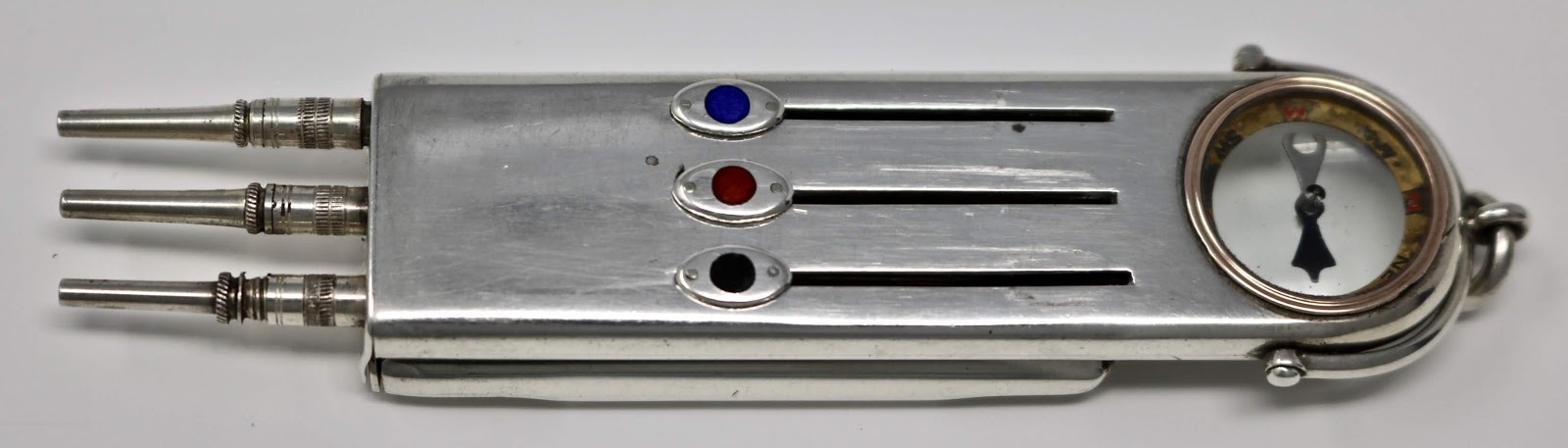 Most of my rarer pencils date to the early to mid-1800’s but this one was so unique and in such exceptional condition that I couldn’t resist. It is fully hallmarked (in two locations) for William Hornby, London, 1901. All three of the pencils are fully functional and are extended by using the enamelled slider buttons. The compass is inset into the pencil within a band of gold. and is still working. The whistle and sun dial flip open from the back. The whistle has a small protective cap of silver. The sun dial is probably the most unique feature. When the whistle cap is removed there is a tiny “v”notch at the open end to catch the sun’s rays. Calibrated at 51 degrees north (as marked just under the “v”), this corresponds to London’s latitude. It can be suspended from an Albert chain using the the swivel and ring located at the top.