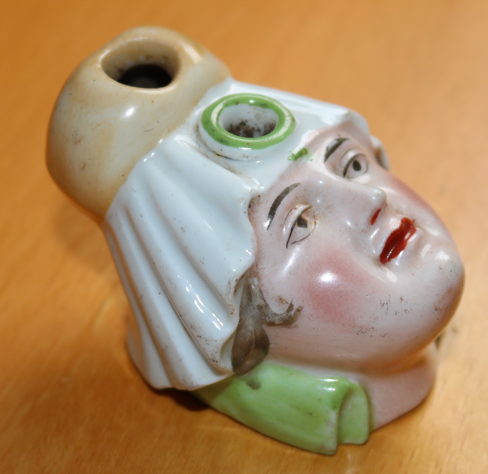 Among the many novelty inkwells were “head” figurals that had a single opening for the ink cavity and then one or more quill holder holes elsewhere on the piece. Most of these inkwells were not of particularly high quality which makes their survival for almost 200 years all the more impressive!