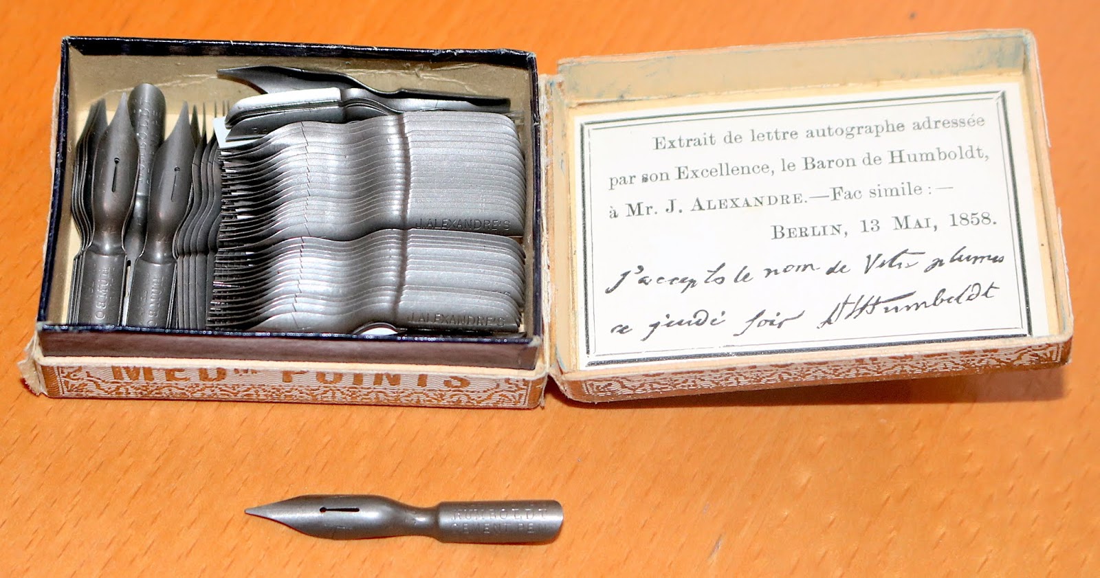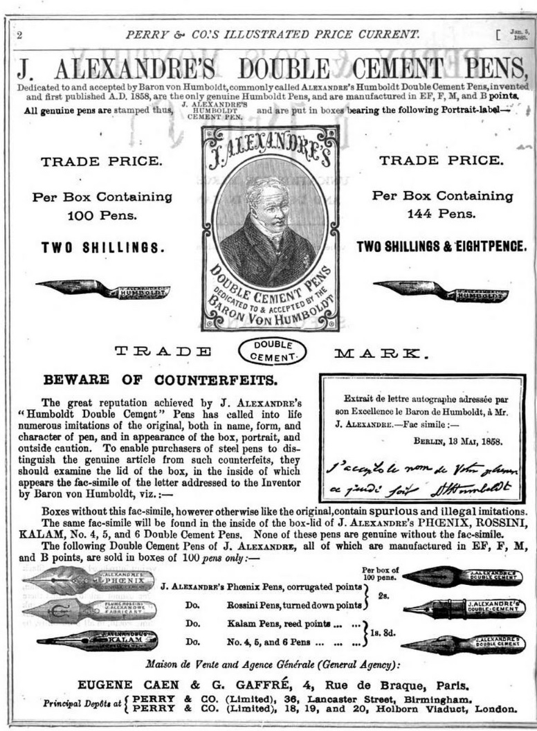 J. Alexandre’s “Baron Von Humboldt Pen” – These nibs were made by Perry & Co. around 1860 (the nib box contains a facsimile of part of a letter of approval from the Baron to J. Alexandre dated May 19, 1858). Baron Von Humboldt (1769-1859) was a Prussian polymath, geographer, naturalist, and explorer. He was one of the first to propose that South America and Africa were once connected, and he was the first person to identify human induced climate change (in 1800 and in 1831) based upon his observations during his travels.