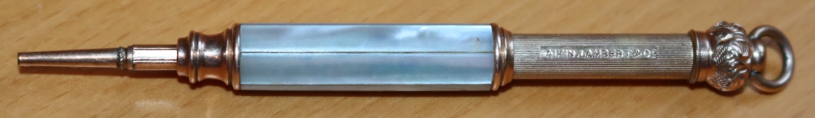 Aikin, Lambert, & Co. – Mother-of-Pearl Magic Pencil – This little pencil would date to around 1870-1885. The barrel is imprinted with “Aikin, Lambert & Co”. James Aikin and Henry Lambert were New York jewellers that had become partners following the civil war to try and get in on the growing pen industry. In addition to their pens & pencils, they made gold pen nibs and became a supplier of nibs to Lewis Waterman. In the early 20th century Waterman took over Aikin, Lambert. The pencil is 1.75″ closed and it doubles in length to 3.5″ when fully extended.