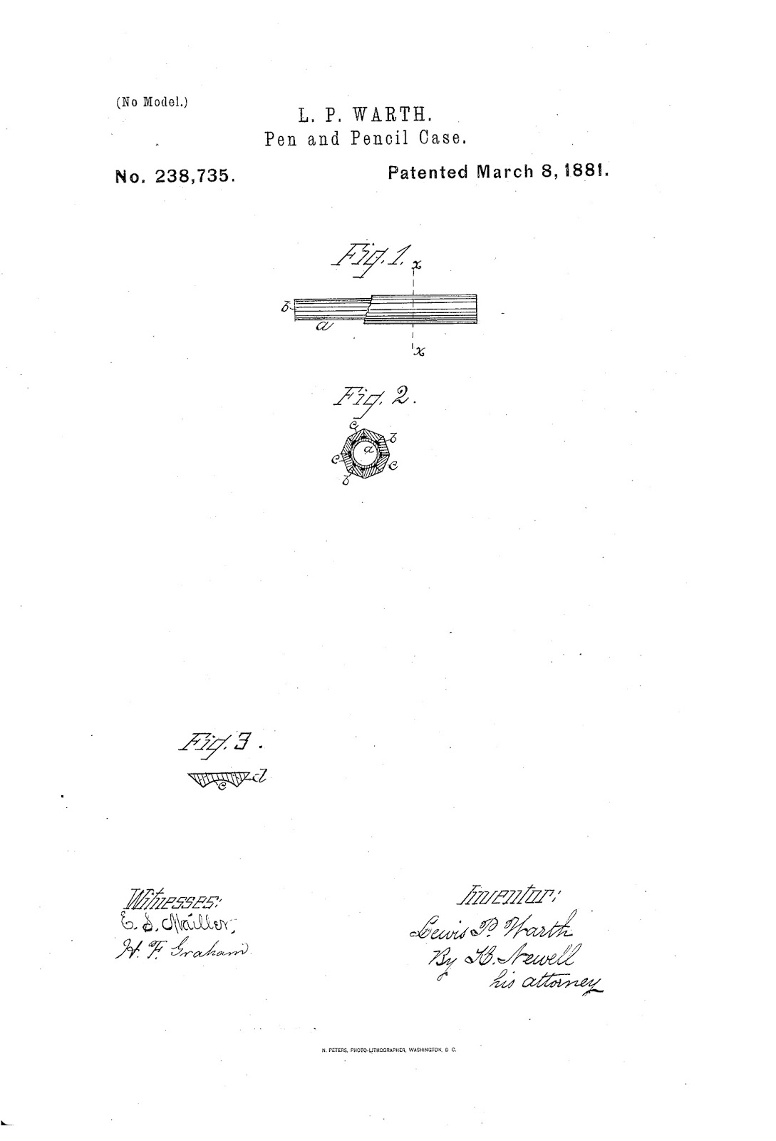 In 1881, Lewis P. Warth, of New York, New York, was granted a patent for an improvement to the technique for applying mother-of-pearl to pencil barrels. The main difference between the two patents seems to be that Warth utilized a round barrel (not polygonal). The mother-of-pearl panels were then bonded to each other and not just to the barrel.