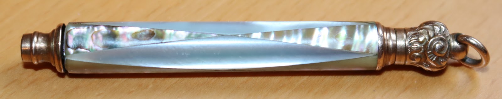 While the inner barrel and mechanisms of most 19th century mechanical pencils were constructed of brass, it was the beauty of each pencil’s outer coverings that would capture the attention of the consumer and help to encourage the separation of hard-earned savings from one’s wallet or purse. Pencil makers of the 19th century experimented with a variety of eye-catching coverings for their writing implements and one of these was mother-of-pearl.